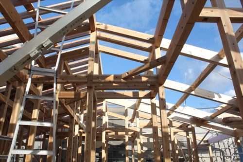 屋根は一見完成に見えるのですが、屋根を断熱しているので、更に垂木と野地板を張る工程を経て、ルーフィングというシートを張り、屋根板がつきます。
