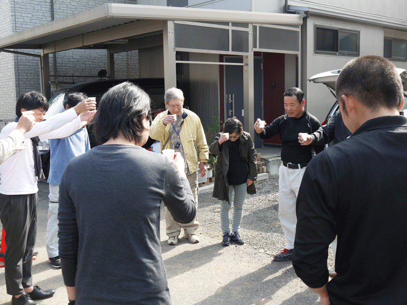 そしてこの後、この上棟に携わった棟梁をはじめ大工さん達、設計士、連空間スタッフ一同で工事の無事を祈って乾杯をしました。
