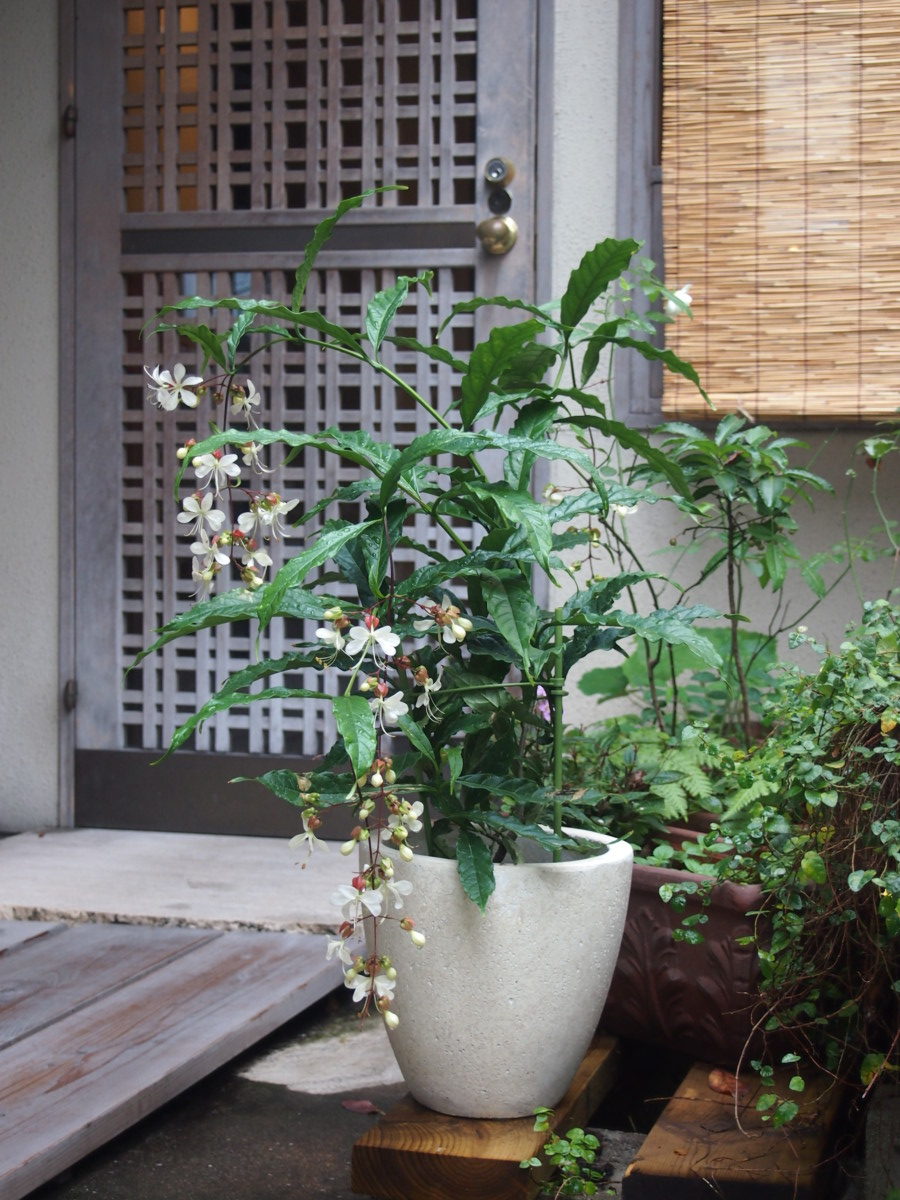 連空間2階で育ててあるクラリンドウの鉢植え。可憐な花が咲いています。晴れの日の植物もいいですが、雨が上がると雫が垂れてそれもまた綺麗。身近に植物がある空間はいいものですね。