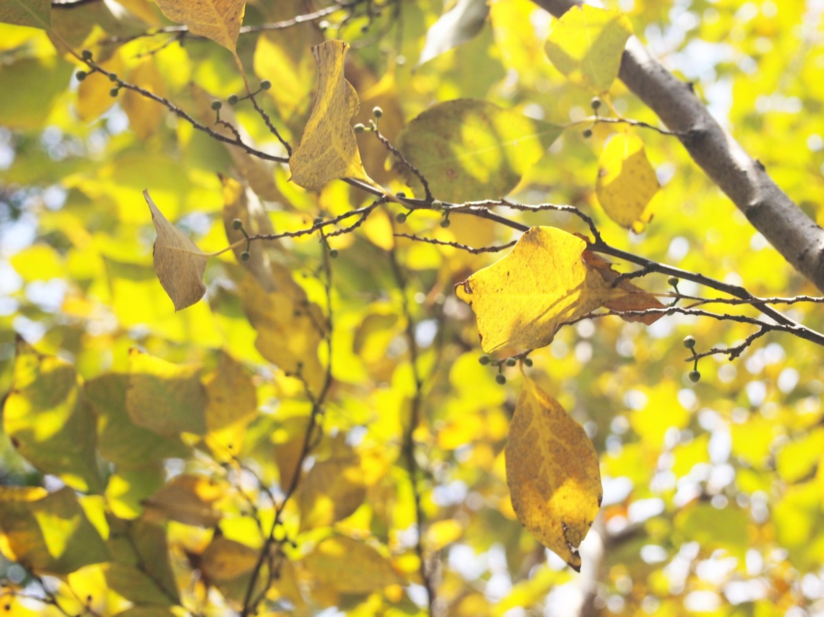 落ち葉で気づくアブラチャンの紅葉。新緑や花の色も綺麗ですが、紅葉も美しい。1階にはアブラチャンの黄色、2階にはモミジの赤、そして色んな色のヒメシャラ。冬へ向かい寒くほんのり寂しい季節ですが、黄、赤、緑、そして空の青と色鮮やかな季節です。