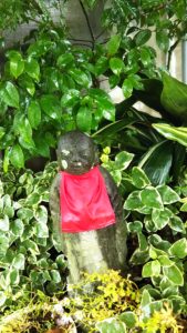 四つ角地蔵さんは雨に濡れてもいつもとおんなじ。穏やかな表情で通りを見守ってくれています