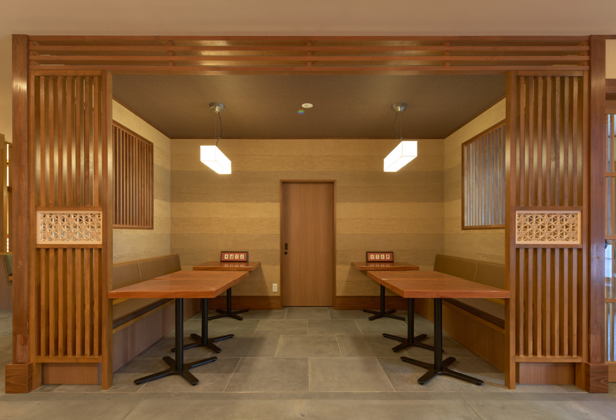 この空間の壁面は版築風の左官仕上げとし、熊本県の県花である竜胆を象った組子細工をあしらっています。