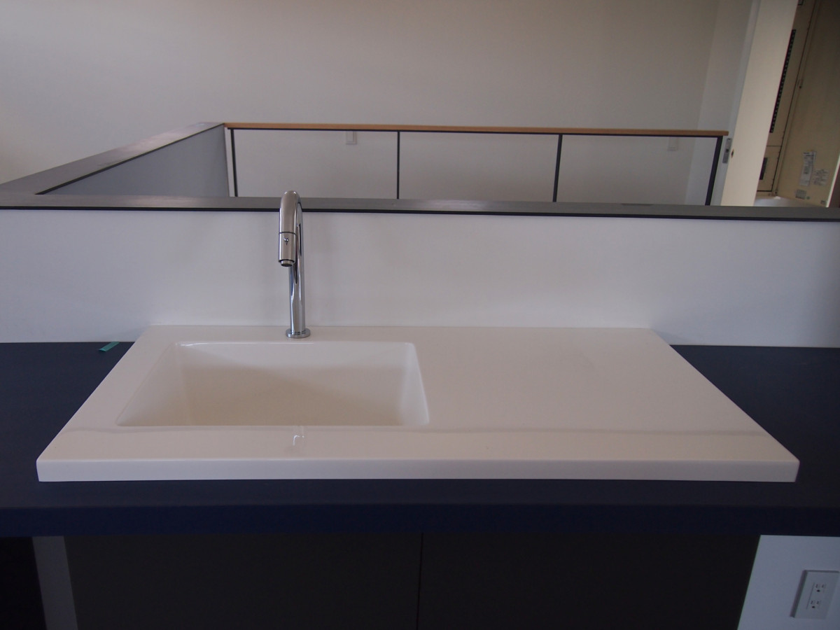 水栓は吐水口にハンドルが付いているものを採用し、シンク外が濡れにくいようにしています。