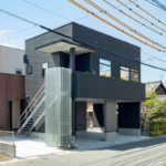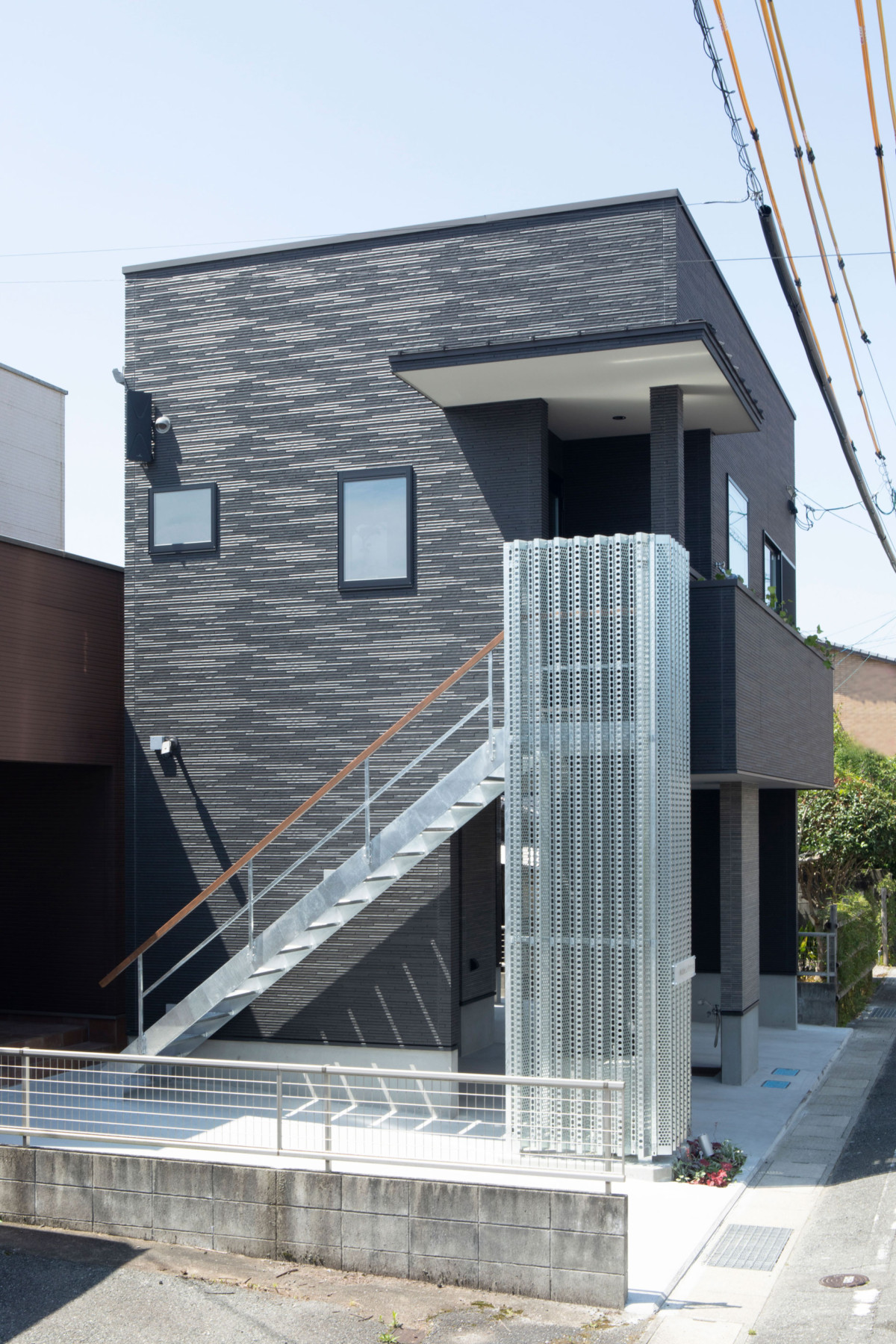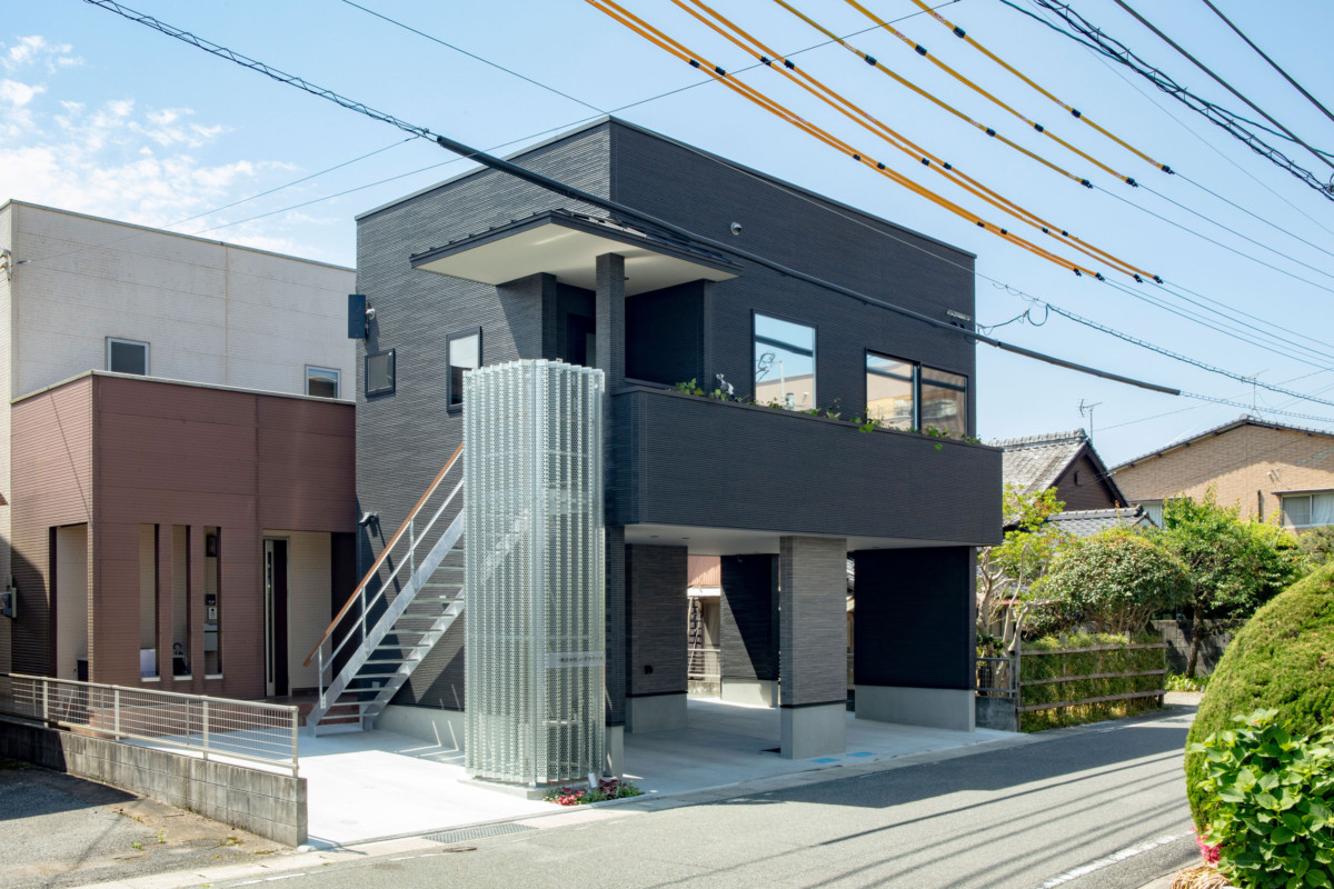 外観はお客様こだわりの黒い外装と金属の階段とし、2階の窓際には緑を配して通りからの印象を和らげました。