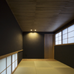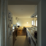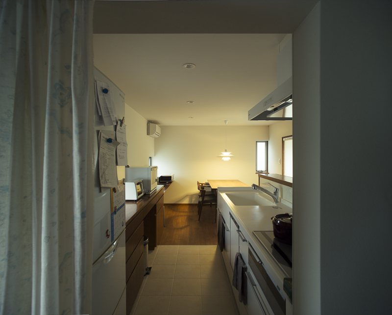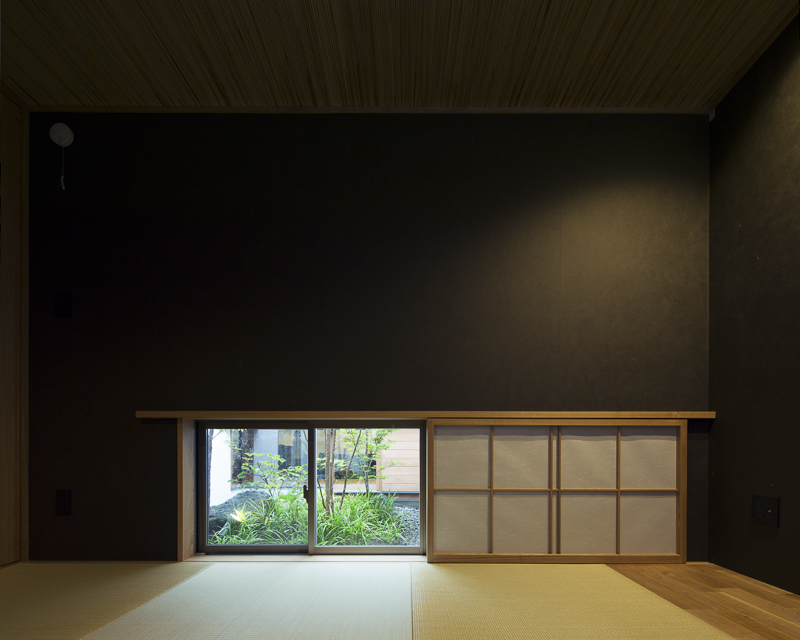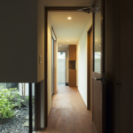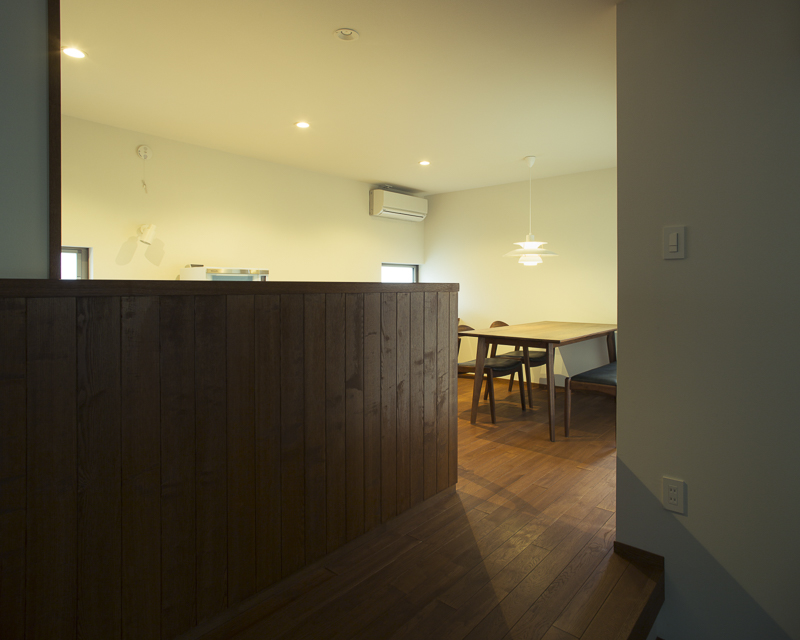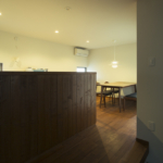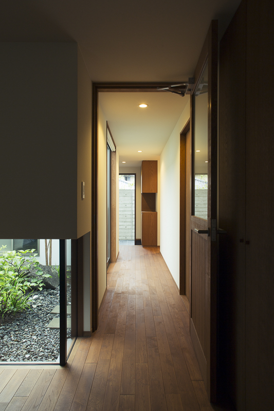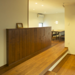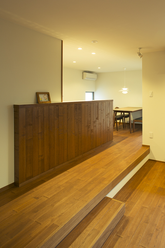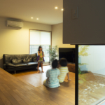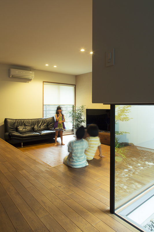 中庭を中心に部屋を配置しているので、外からの目線を気にせず過ごすことができる。中庭の周りをぐるりと子どもたちが走り回ることができる間取り。リビングはフロアーを下げることで隣接するダイニングキッチンと空間を区別し、家族でゆっくりした時間を過ごせる。通りから玄関が見えないように建てた塀はお家の目印にも。