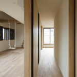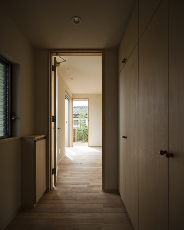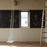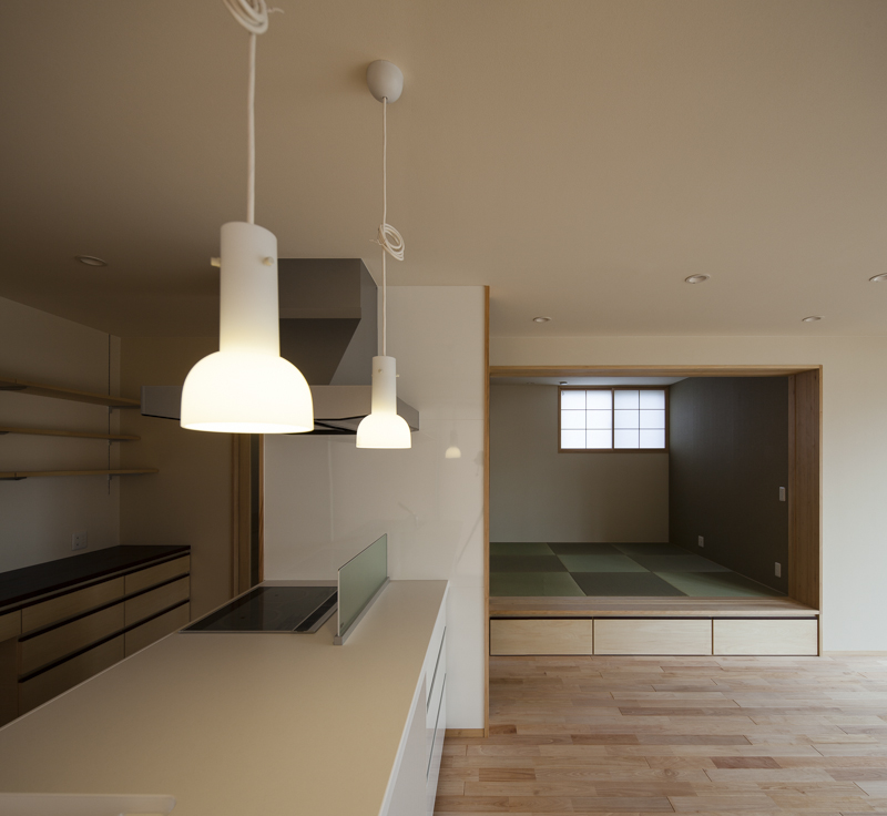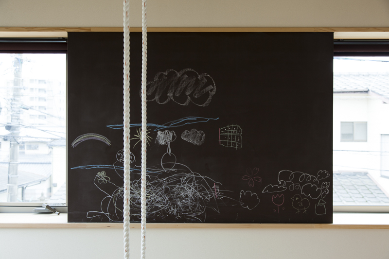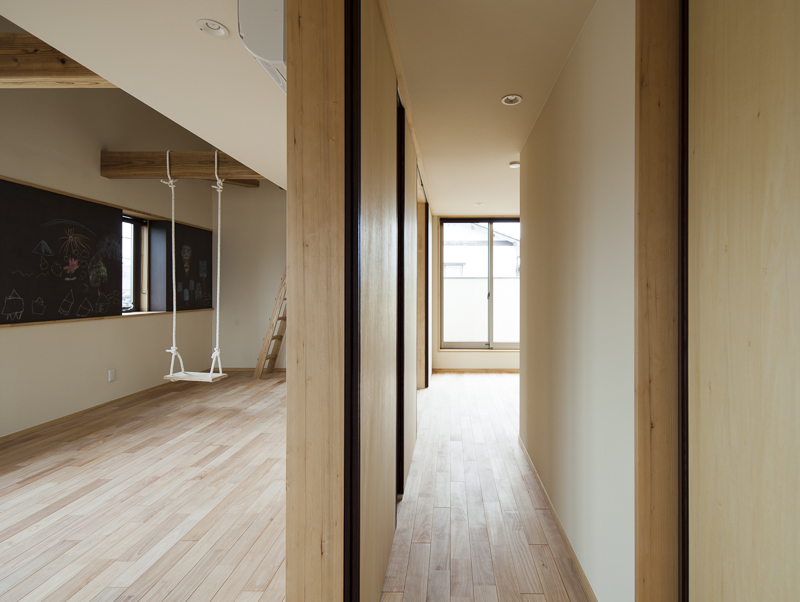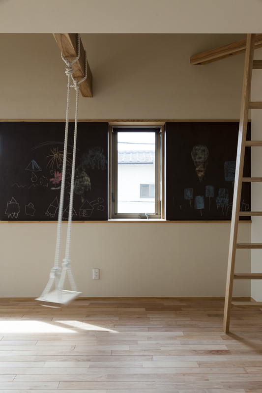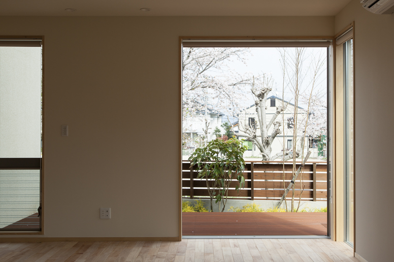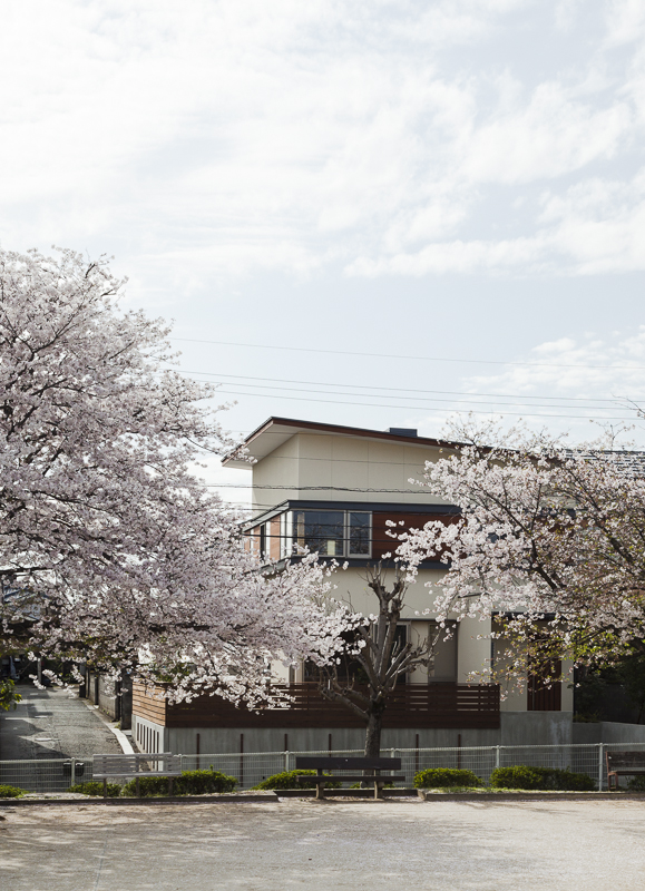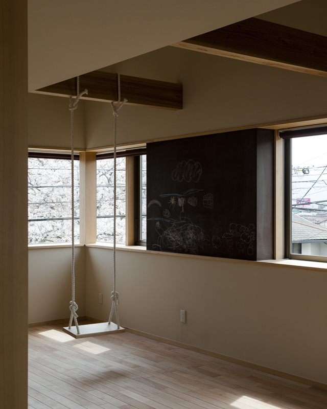 コンセプトは「桜」。桜を愛し、桜と共に人生を楽しむ家族のための家。そんな言葉がふさわしい。眼下には公園の桜が溢れ、床材にも桜を採用。室内外に淡く綺麗な桜色が溢れている。大容量の収納空間を擁する玄関を構え、奥にはリビングダイニング。小上がりの和室が落ち着きを与える。外部デッキの高さをリビングダイニングの床と合わせた事で、窓を開けると室内と外部が一体となる。二階の子供室にはロフトと、壁に据え付けられた黒板。まさに人生を楽しむための家が完成した。