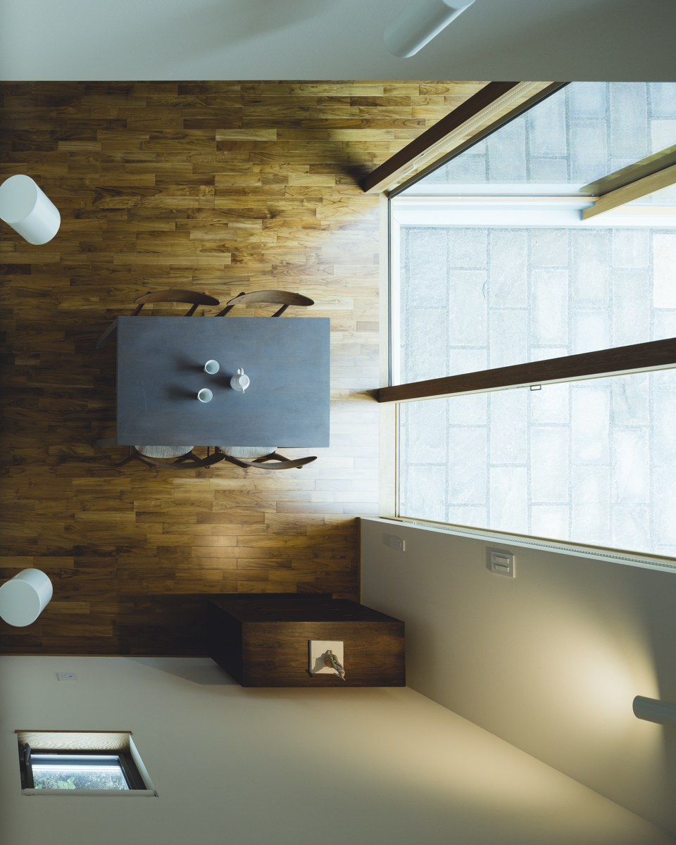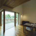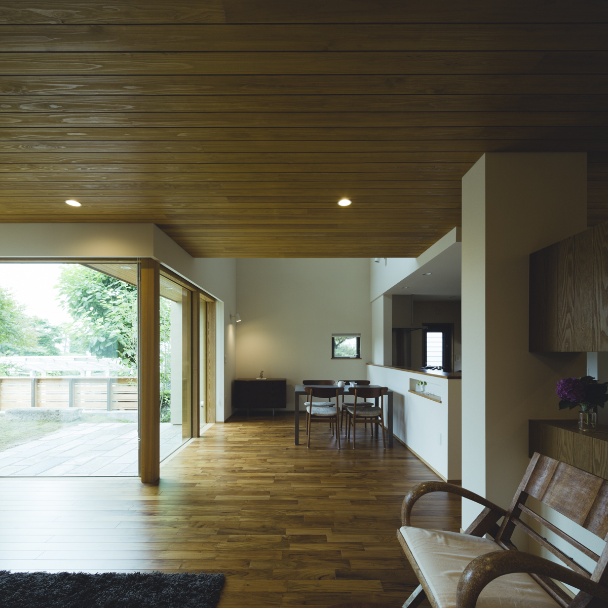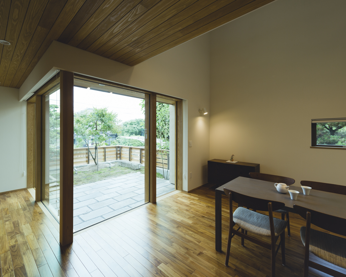 人が集まれる家をメインコンセプトに計画しました。奥に細長い形状の敷地で、正面の外観はその奥行きを際立たせるような印象的な表情としています。1階中央には吹き抜けのあるダイニングとリビング。庭を囲むように部屋を配置し、大きな窓を取り付け、屋内・テラス・庭が一つの空間となって広々とした印象を与えるよう配慮しました。またリビングとその横の小さな和室は、緩やかに棚で仕切り、落ち着く空間でありながらも程よく人の気配を感じられるようにしてあります。2階は吹き抜けを見下ろせる廊下に、長いデスクを作りました。子ども部屋は入口の3枚の引き戸を壁に収納できるようにして、部屋と廊下を一体的にも使えます。家族の変化に合わせて柔軟に対応できる設計としました。