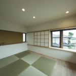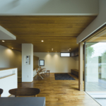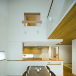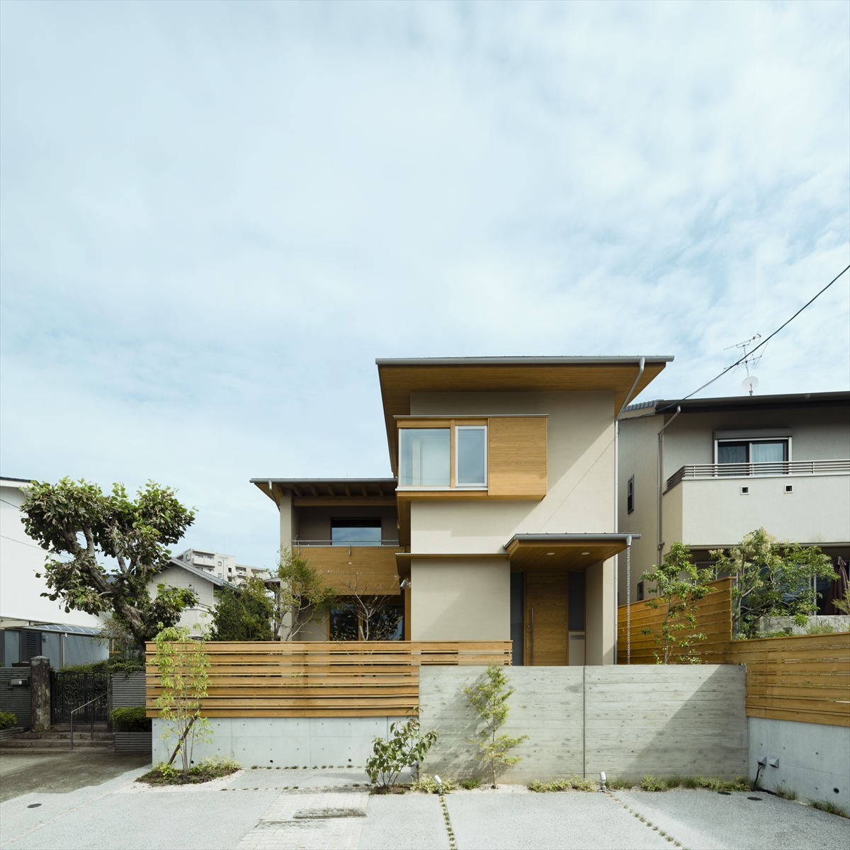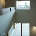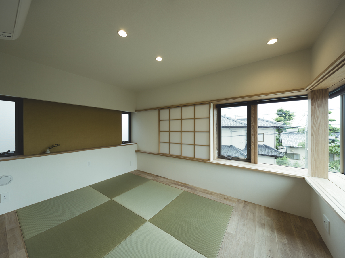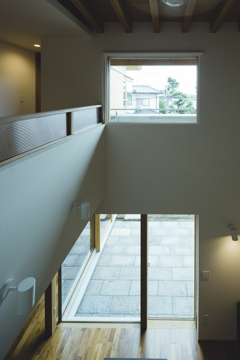 人が集まれる家をメインコンセプトに計画しました。奥に細長い形状の敷地で、正面の外観はその奥行きを際立たせるような印象的な表情としています。1階中央には吹き抜けのあるダイニングとリビング。庭を囲むように部屋を配置し、大きな窓を取り付け、屋内・テラス・庭が一つの空間となって広々とした印象を与えるよう配慮しました。またリビングとその横の小さな和室は、緩やかに棚で仕切り、落ち着く空間でありながらも程よく人の気配を感じられるようにしてあります。2階は吹き抜けを見下ろせる廊下に、長いデスクを作りました。子ども部屋は入口の3枚の引き戸を壁に収納できるようにして、部屋と廊下を一体的にも使えます。家族の変化に合わせて柔軟に対応できる設計としました。