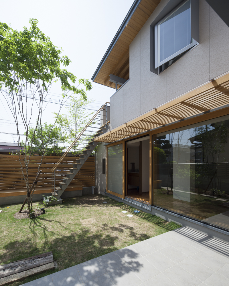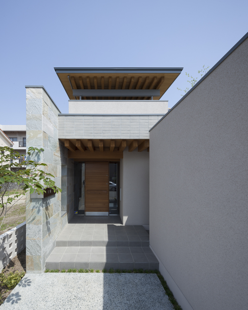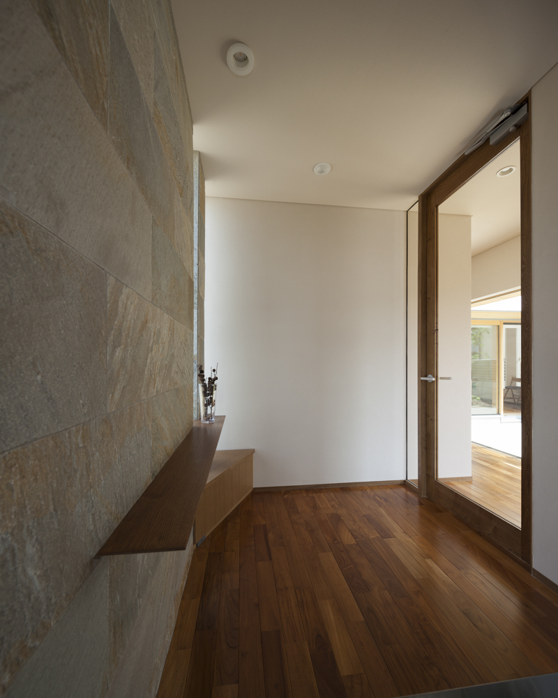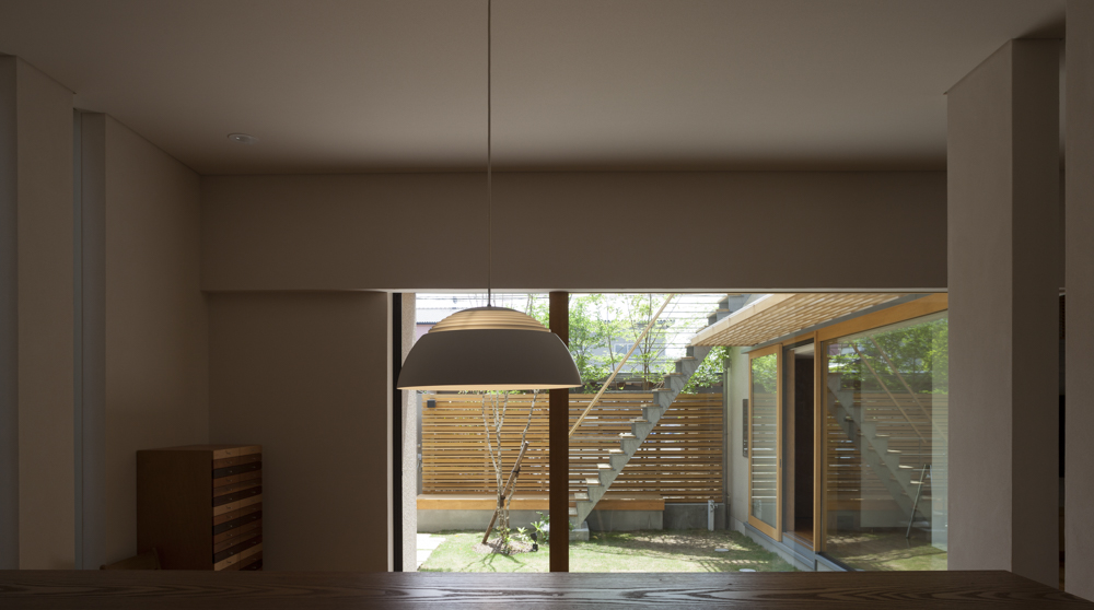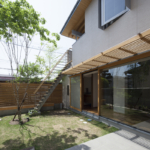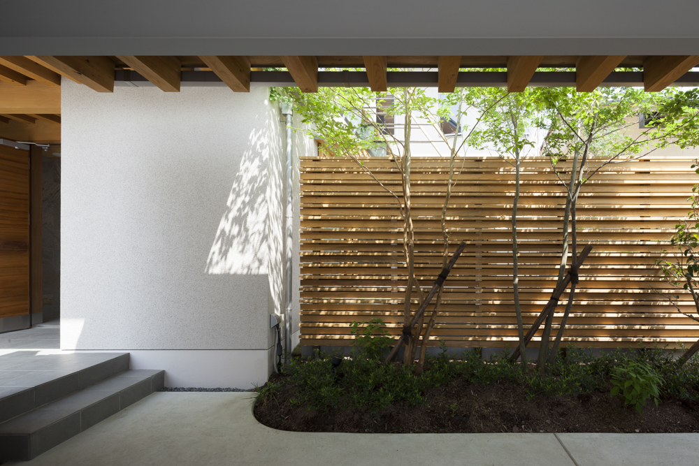 奥行きの深い敷地に建つ住宅。白い外壁と、玄関へと続く石貼りの壁が印象的。アオダモが植わる中庭の外階段からは2階のバスコートへ直行できる。育ちざかりの子供達がどろんこになって帰ってきてもひと安心。キッチンとリビングは間仕切りながらも、そこで過ごす家族の様子が感じられる工夫を。2階へ上る階段には、手すりの代わりに本棚とベンチをしつらえ、座った時に見える壁はギャラリーのように。たくさんの職人さん達の手しごとと自然の素材でつくった空間は、ゆっくりと時間をかけて変化し、愛着を生み出す。丁寧に暮らすことを意識させてくれます。