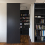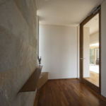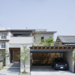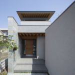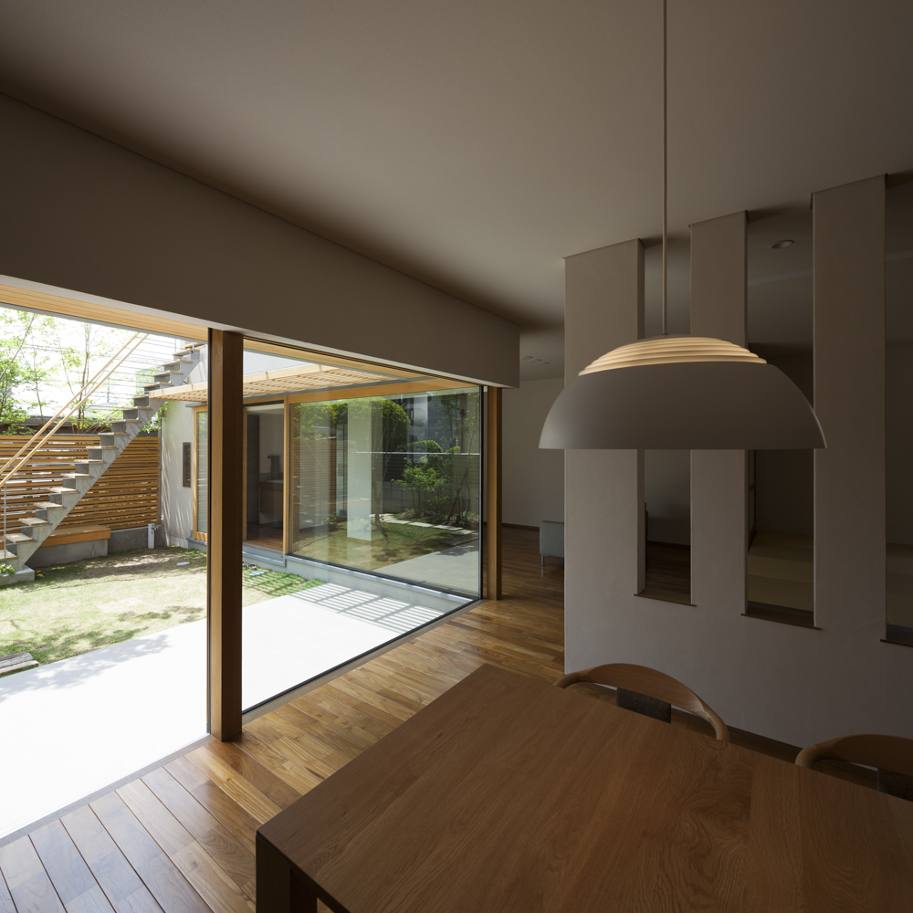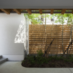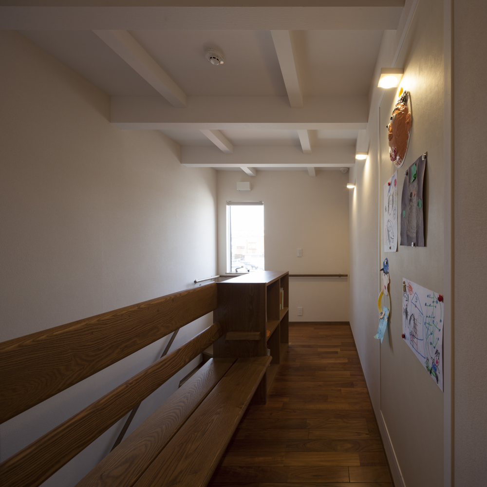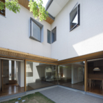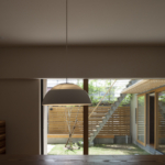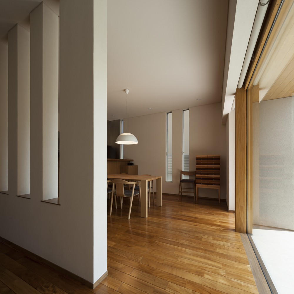 奥行きの深い敷地に建つ住宅。白い外壁と、玄関へと続く石貼りの壁が印象的。アオダモが植わる中庭の外階段からは2階のバスコートへ直行できる。育ちざかりの子供達がどろんこになって帰ってきてもひと安心。キッチンとリビングは間仕切りながらも、そこで過ごす家族の様子が感じられる工夫を。2階へ上る階段には、手すりの代わりに本棚とベンチをしつらえ、座った時に見える壁はギャラリーのように。たくさんの職人さん達の手しごとと自然の素材でつくった空間は、ゆっくりと時間をかけて変化し、愛着を生み出す。丁寧に暮らすことを意識させてくれます。