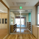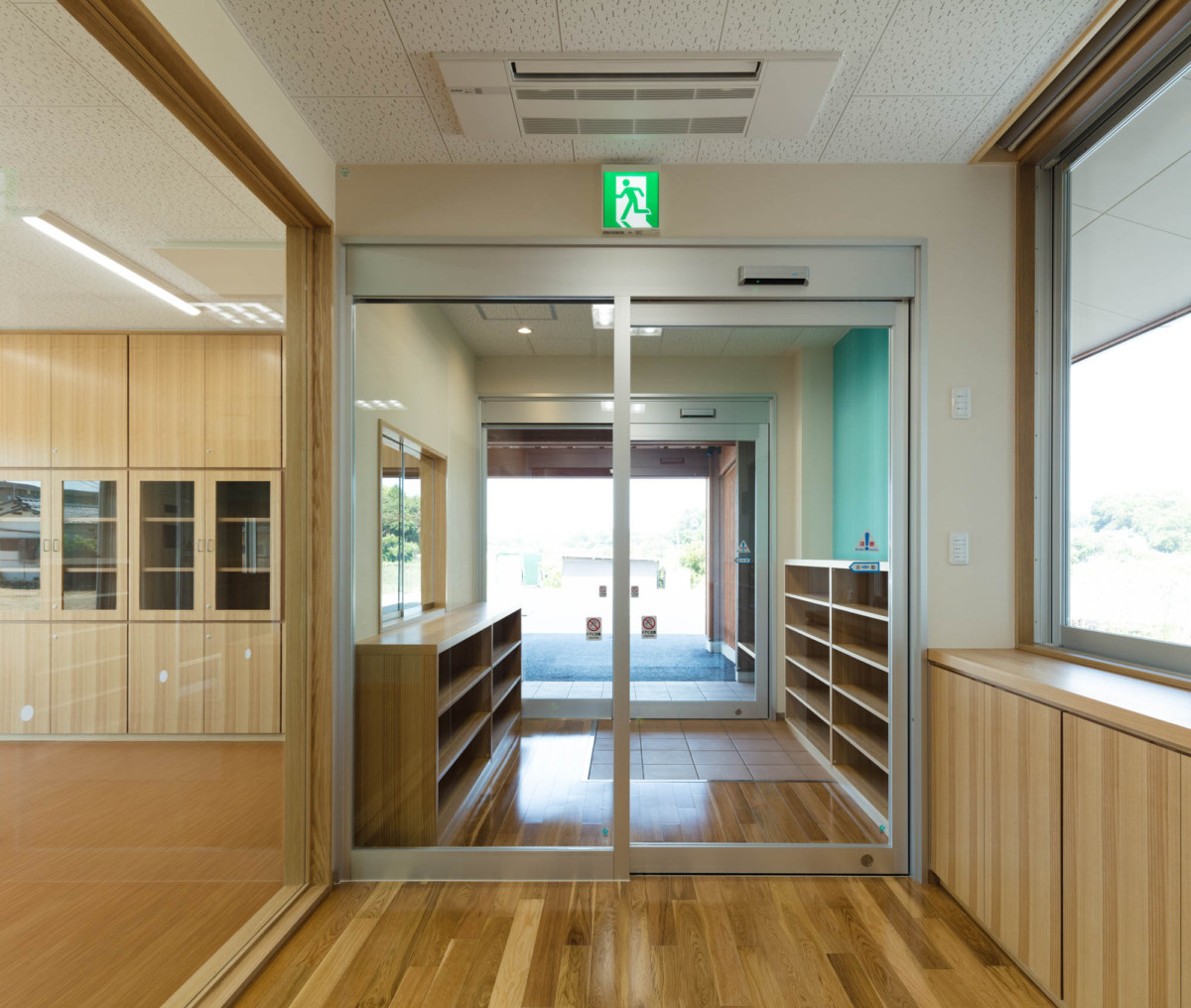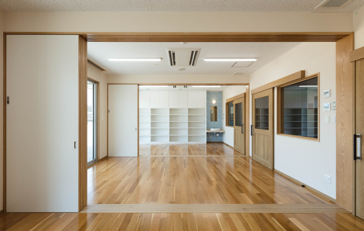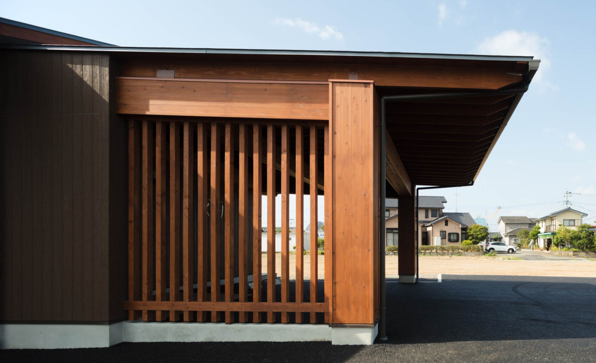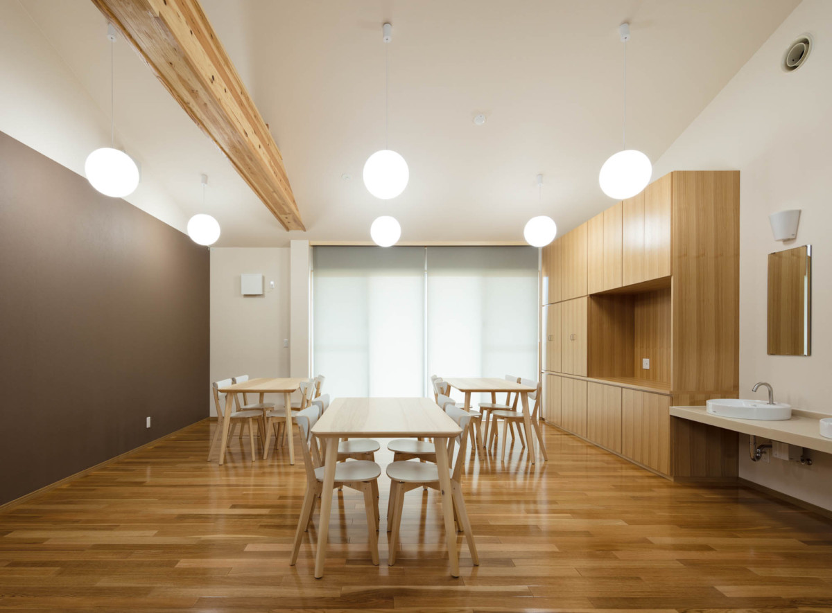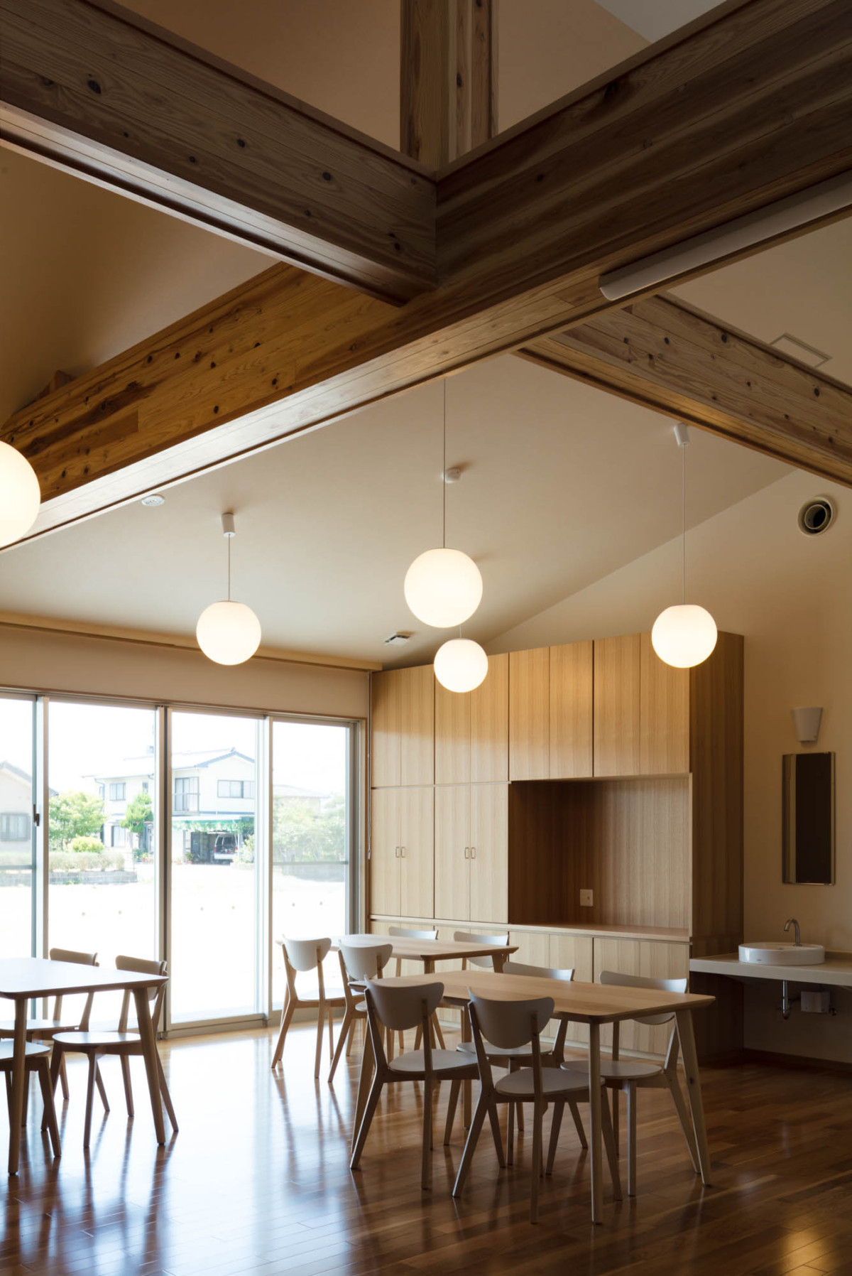 また、南向きの園庭を臨む各部屋には、すべて掃き出し窓を取り付けて、広々とした外のウッドテラスとの連続性を持たせることで、戸外との繋がりを意識。玄関のしっかり張り出した軒は、雨の日でも濡れずに車から乗り降りできるよう、利用者への優しさを見せている。