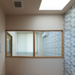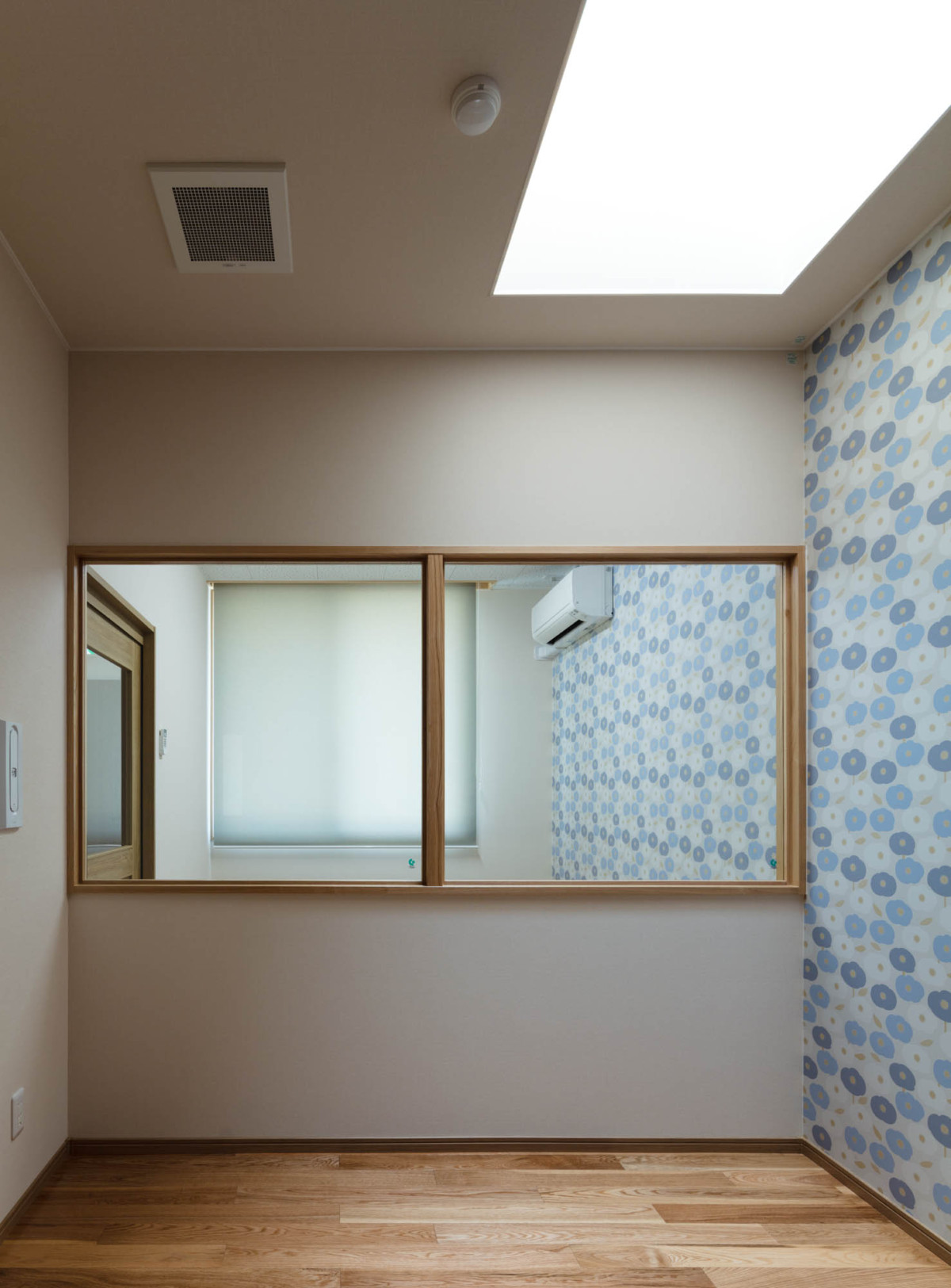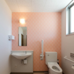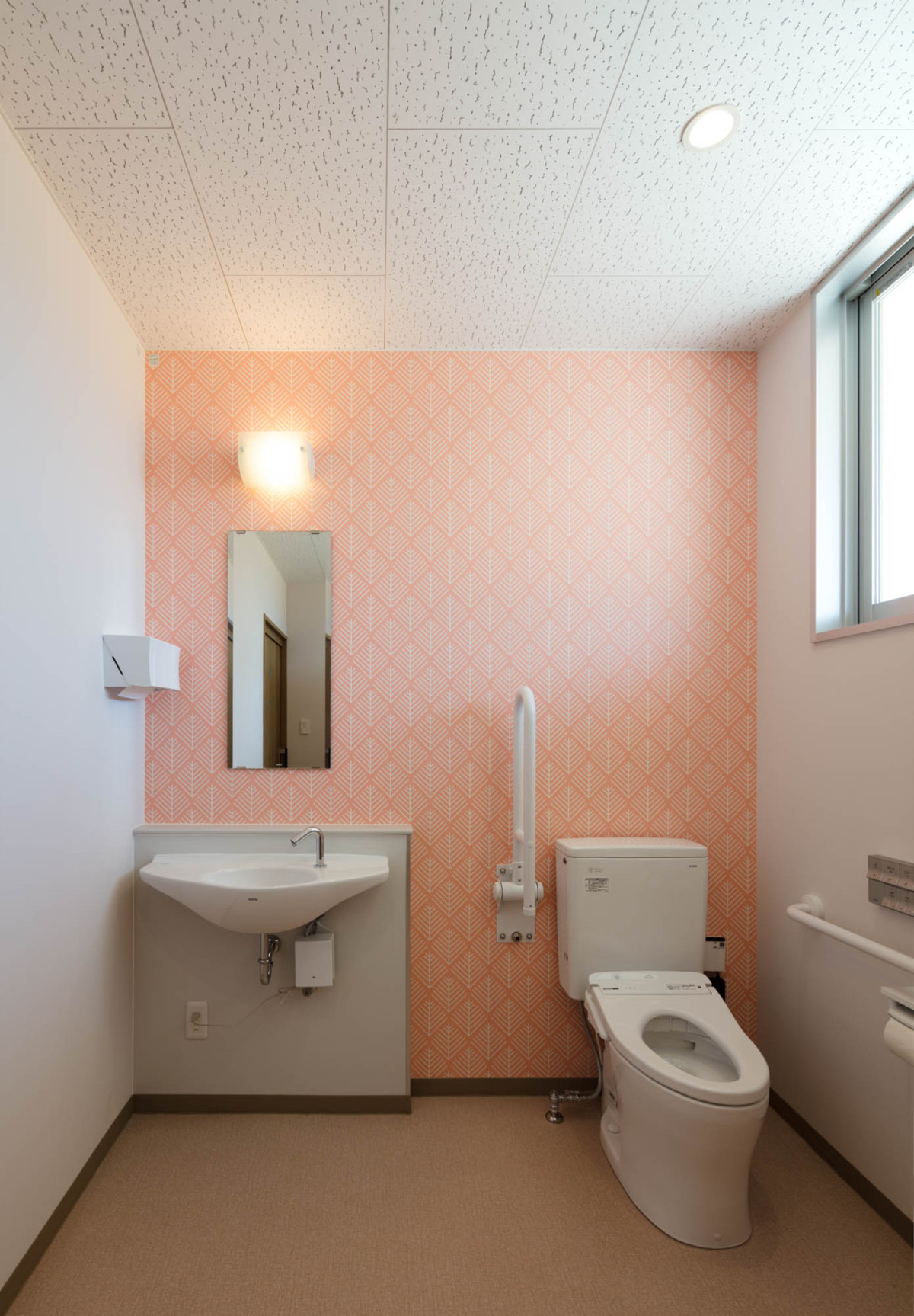 内装は全体的に落ち着いたトーンでまとめながらも、指導訓練室・医務室・トイレはそれぞれ異なる可愛らしい壁紙のアクセントで子どもたちの笑顔を誘う。