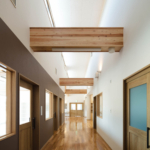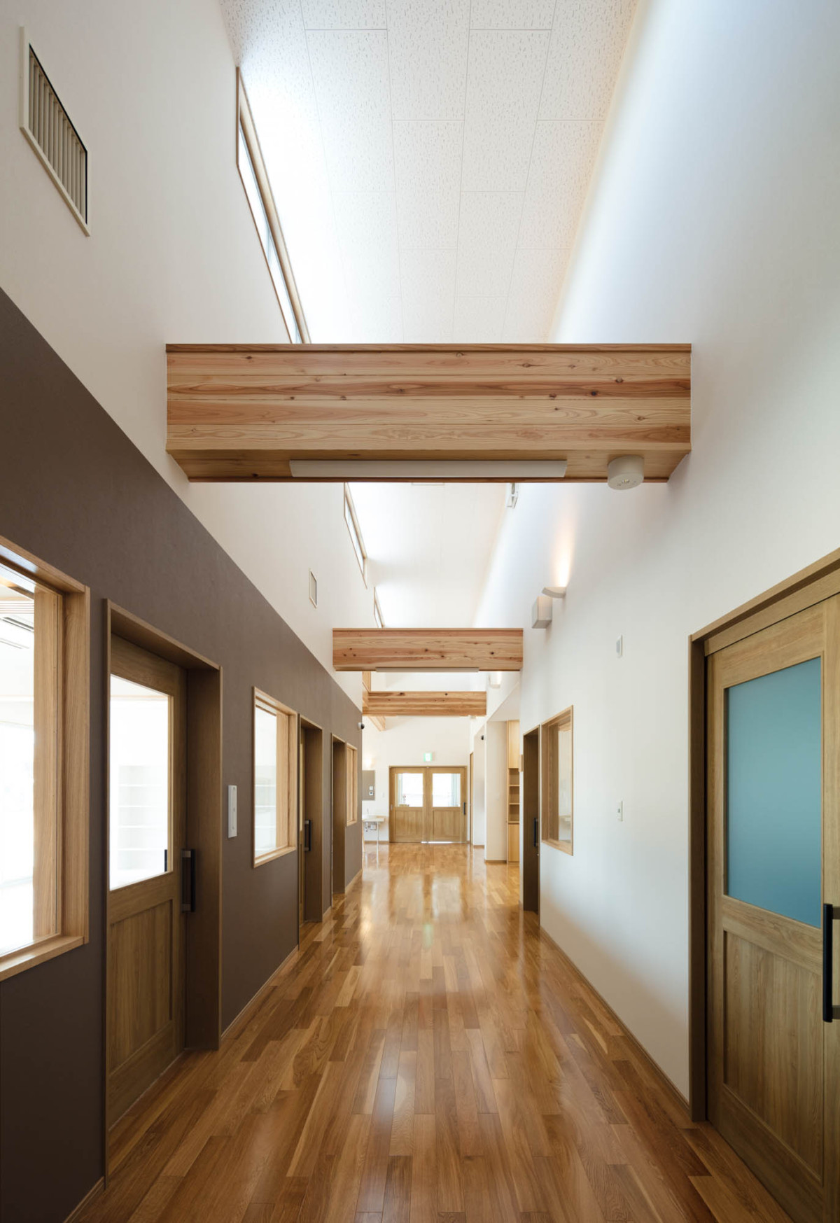 特に人が最も多く行き交う建物中央部分の地域活動支援センターと廊下は、開放感を意識して天井を高くし、屋根の中央部を持ち上げて窓を取り付け、光を間接的に館内へ導くよう工夫した。
