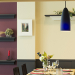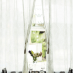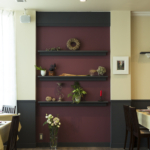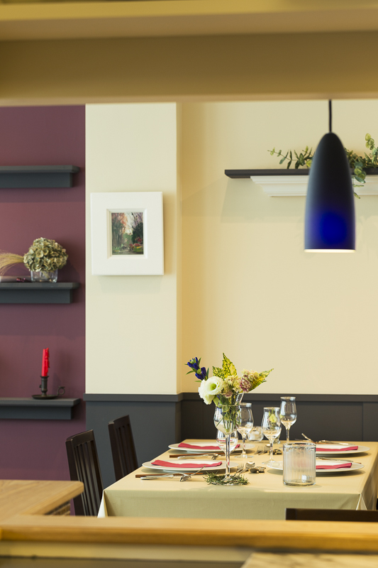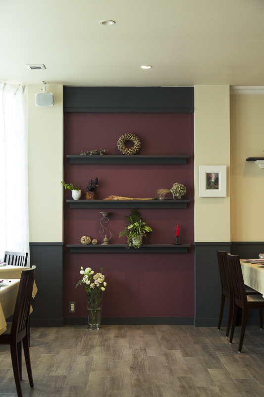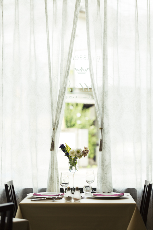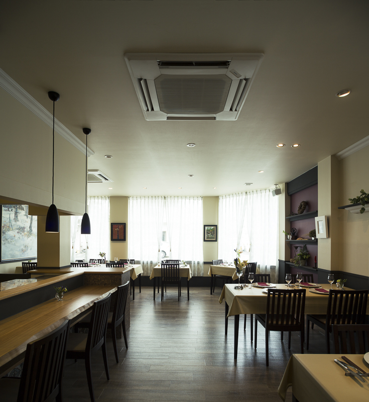 テーブル席は大開口の窓からレースカーテン越しに柔らかな光が漏れ、そこでは繊細な季節のお料理を楽しむことが出来る。オーナーのお客様を大切にしたいとの想いから、オープンな厨房にした。客席からは料理の様子を見ることが出来る。シックな色調によってモダンで上品な室内空間となっており、臙脂色の飾り棚はテーブルクロスと揃えてある。