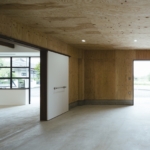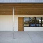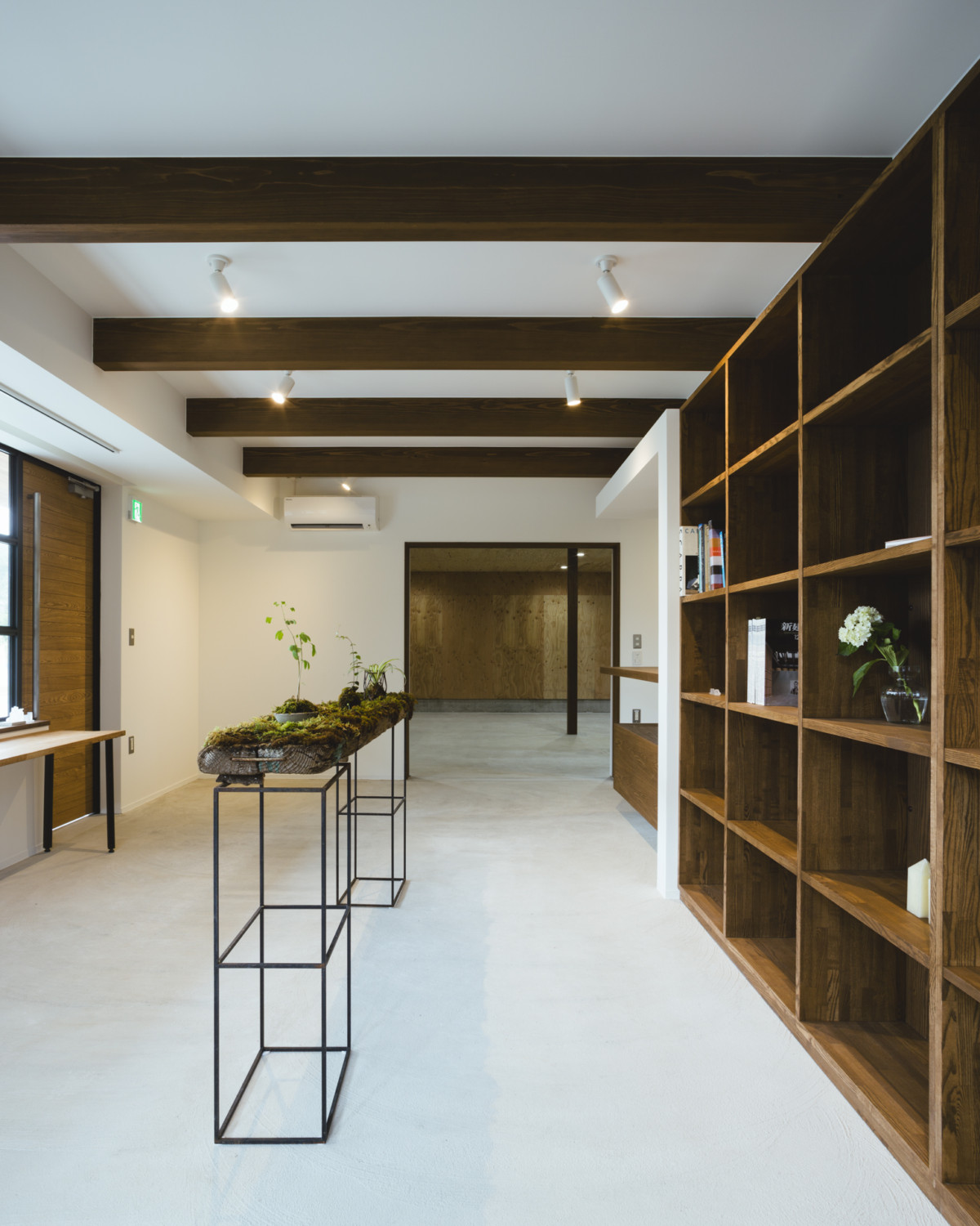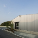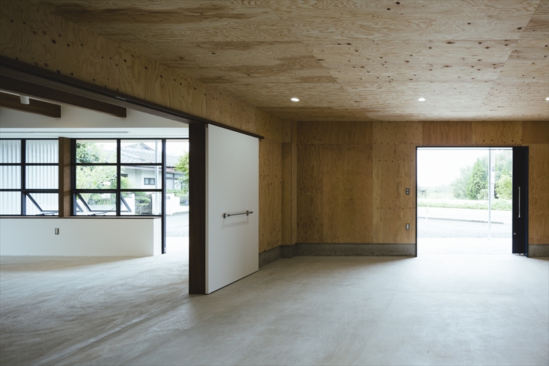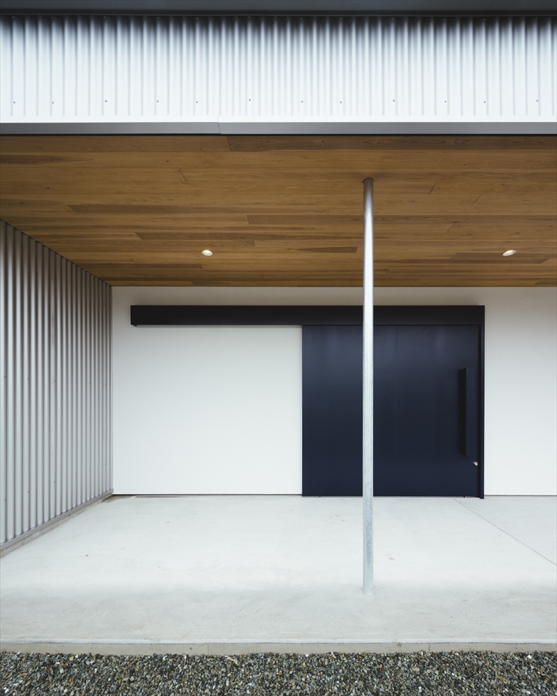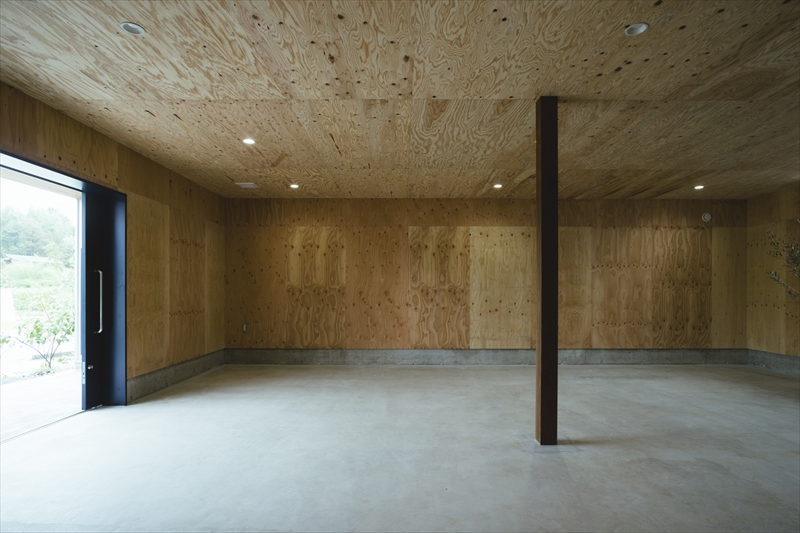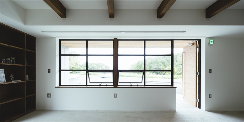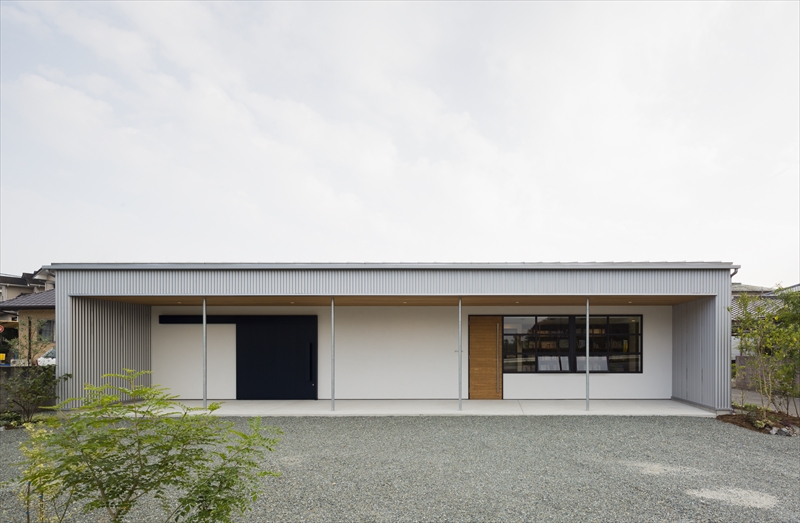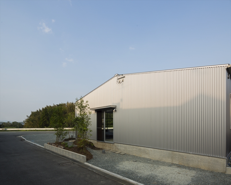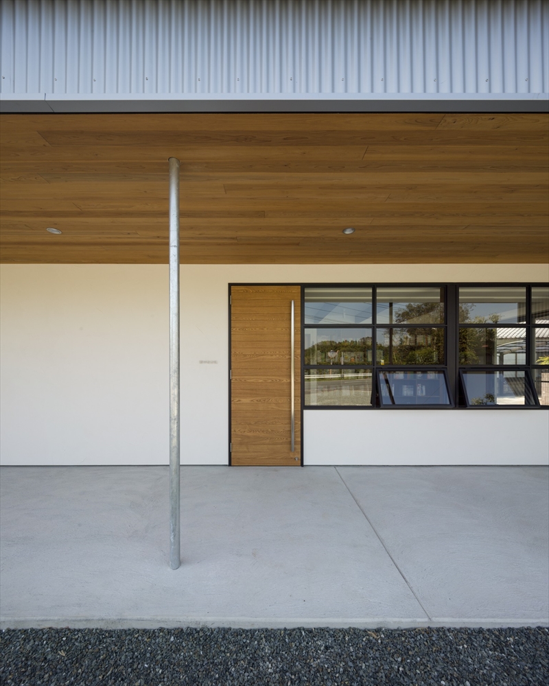 建物を敷地の南側に寄せて配置し、余った県道沿いの北側のスペースを駐車場としました。駐車場に面してポーチを確保し、トラックで運ばれてくる教材等の荷下ろしのスペース、また来訪者が滞在できる場所として、幅、奥行ともに十分な広さを持たせました。倉庫と物販スペースは大きな開口により内部的に連続した空間とし、また外部的にもポーチを介して緩やかに繋がる空間としました。