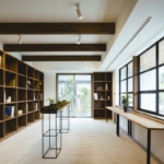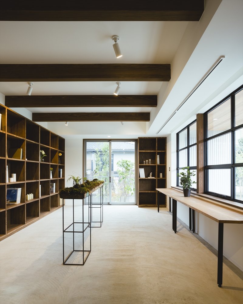 本計画は比較的交通量の多い県道沿いの住宅街に立地する店舗兼倉庫(教材店)の計画であり、教材店に必要な事務所と物販スペース、倉庫を主体とした空間構成です。