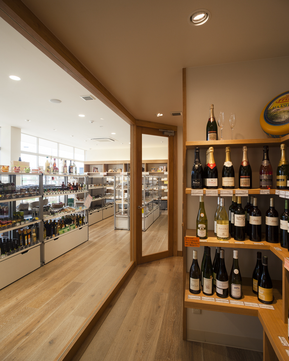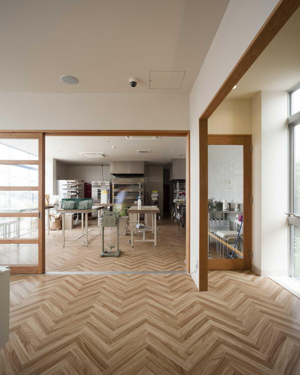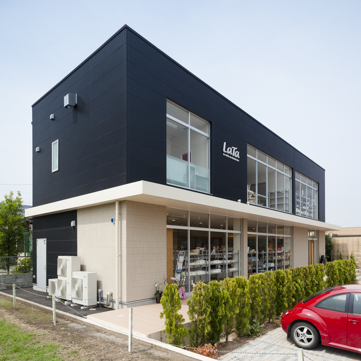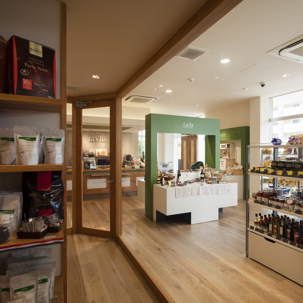 アーバンな雰囲気の製菓材料店。区画整理で新しく生まれた町に合わせ、シャープな外観をデザインした。業態柄、何百に及ぶアイテム数をスッキリと見せるよう什器もシャープでシンプルなものを採用する一方、温かみを持たせるために床を木調とした。2階は教室になっており、ヘリンボーン貼りの床が冷たさを抑え賑やかさを与える。人を大切にする企業方針は人を育てた。出入口の木製扉はかつてのお弟子さんが木工職人となり師匠の恩に応えた作品だ。