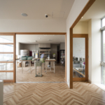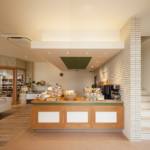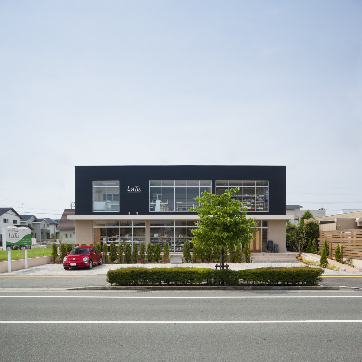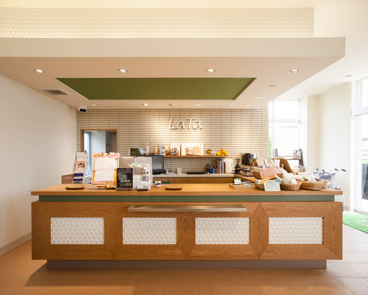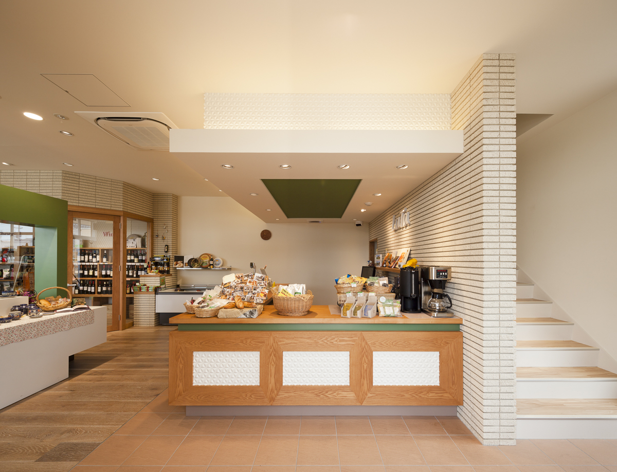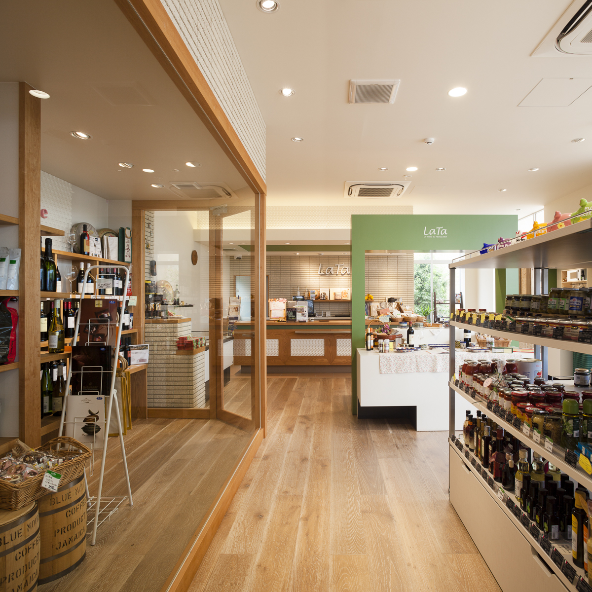 アーバンな雰囲気の製菓材料店。区画整理で新しく生まれた町に合わせ、シャープな外観をデザインした。業態柄、何百に及ぶアイテム数をスッキリと見せるよう什器もシャープでシンプルなものを採用する一方、温かみを持たせるために床を木調とした。2階は教室になっており、ヘリンボーン貼りの床が冷たさを抑え賑やかさを与える。人を大切にする企業方針は人を育てた。出入口の木製扉はかつてのお弟子さんが木工職人となり師匠の恩に応えた作品だ。